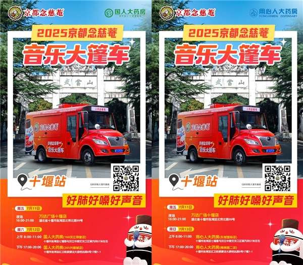 好肺好嗓好声音,2025念慈菴音乐大篷车着满载音乐与欢乐,继续在4条特色线路中前行,把念慈菴好声音唱响全国的每一个角落。2025年7月11日至13日,大篷车到站十堰,为十堰的市民朋友带来精彩纷呈的音乐演出,更带来护嗓养肺的全新体验。诚邀大家共赴这场视听与健康的盛宴!