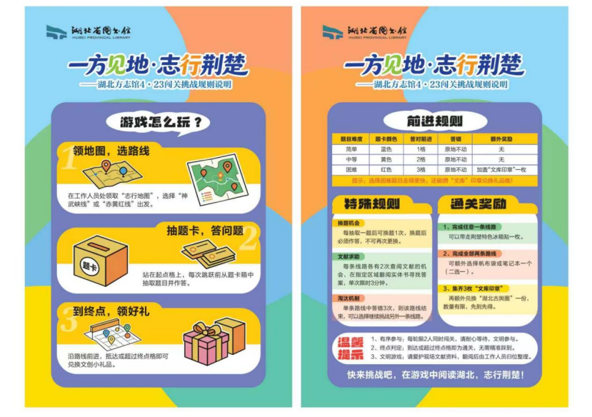 游戏互动区创新设计“神武峡”“赤黄红”两条文旅闯关路线,将全省12个地级市、1个自治州、3个直管市、1个林区的历史人文知识转化为“知识格”,用文旅闯关路线串联形成“志行荆楚”地图。读者抽取不同难度的题目,在答题中体验文旅路线、了解方志知识,用脑力熟悉湖北、用脚步“志行”荆楚。闯关题目难度分层设置,鼓励读者组队参与,既彰显了荆楚文化特色,也增强了挑战性与互动体验。